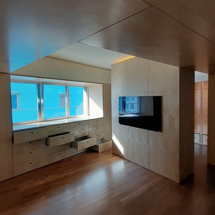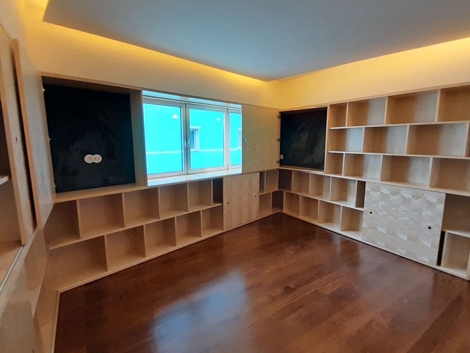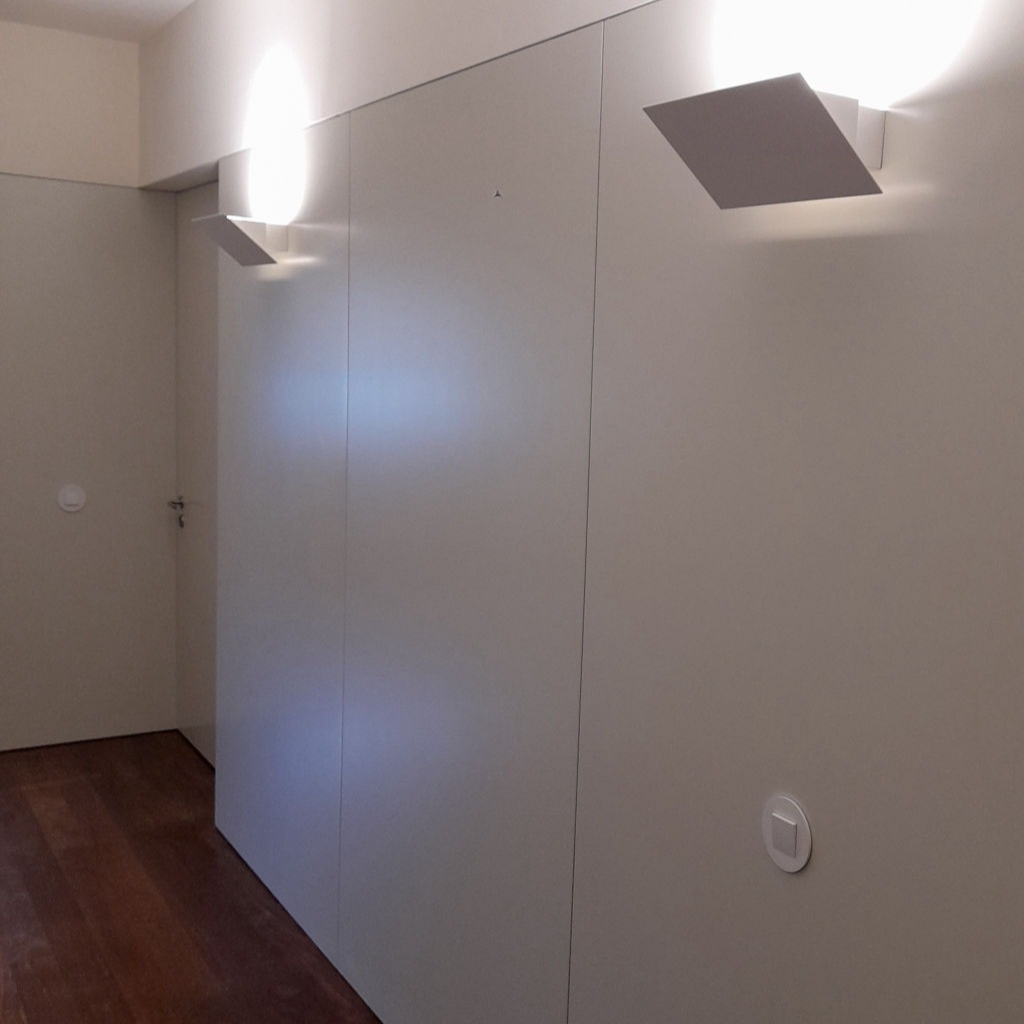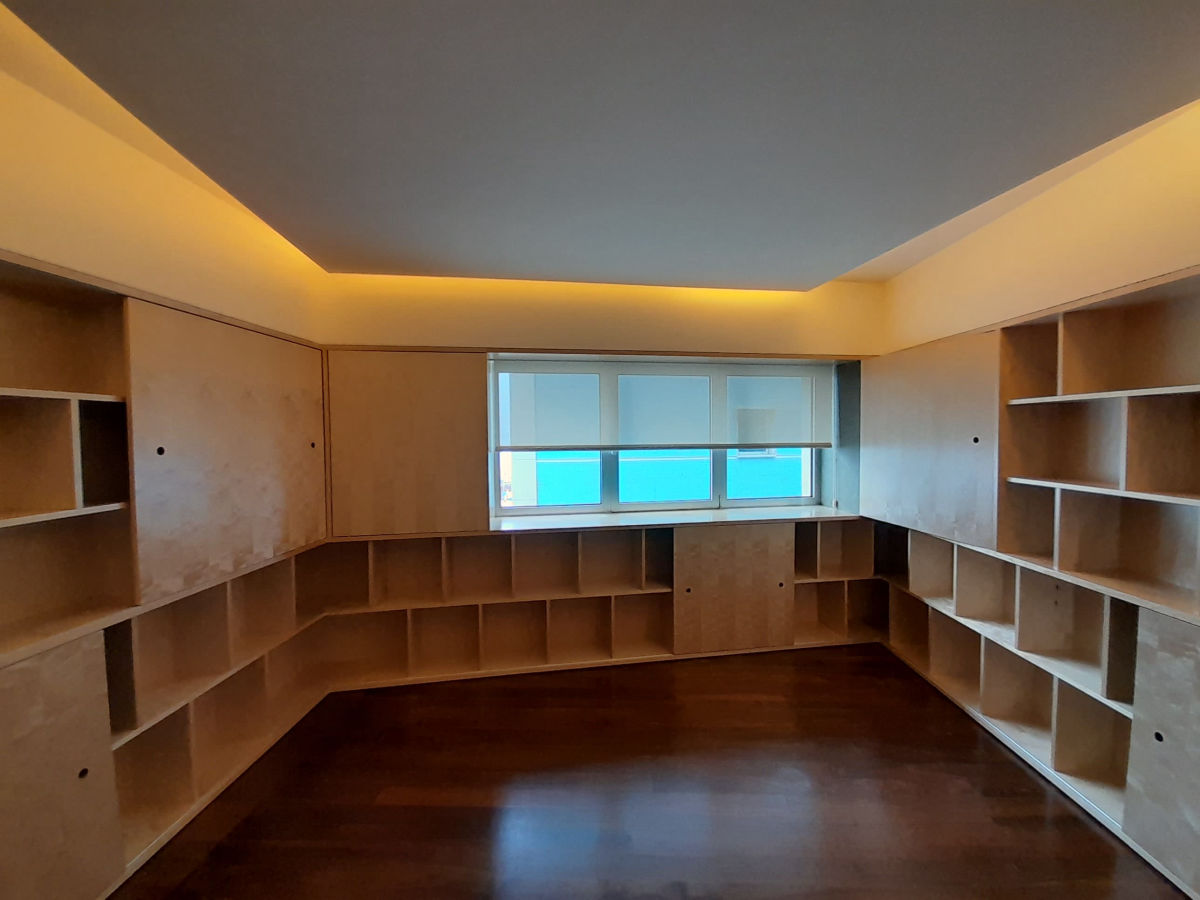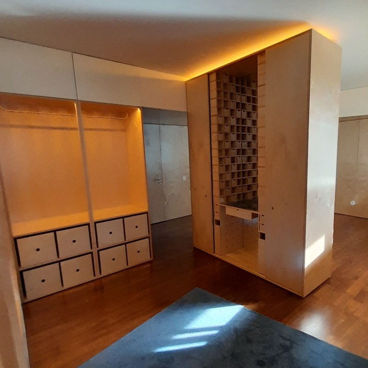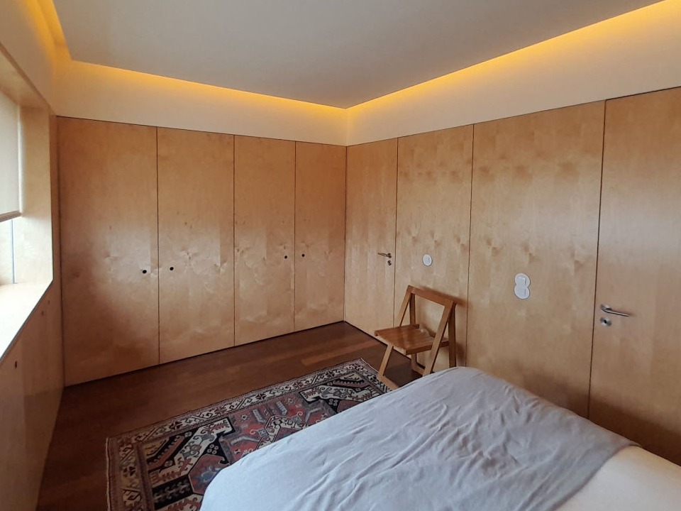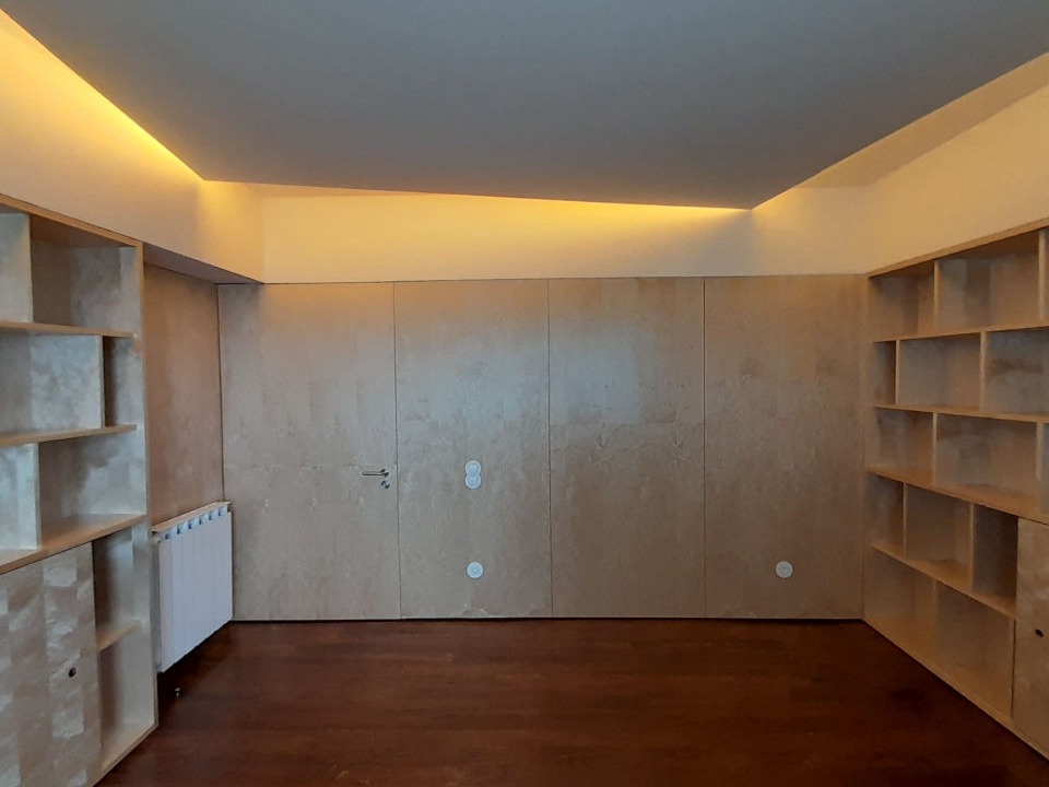 Reabilitação de apartamento T4, as paredes e as novas portas pivotantes foram revestidas com painéis de MDF folheado a Bétula, assim como os armários. Foi criado um closet com vários armários e em particular um toucador estes desenhados com o maior rigor de forma a satisfazer as necessidades do cliente. O escritório também foi alvo de intervenção, onde foram criadas estantes com um design atual, sem juntas à vista e também em madeira de Bétula.