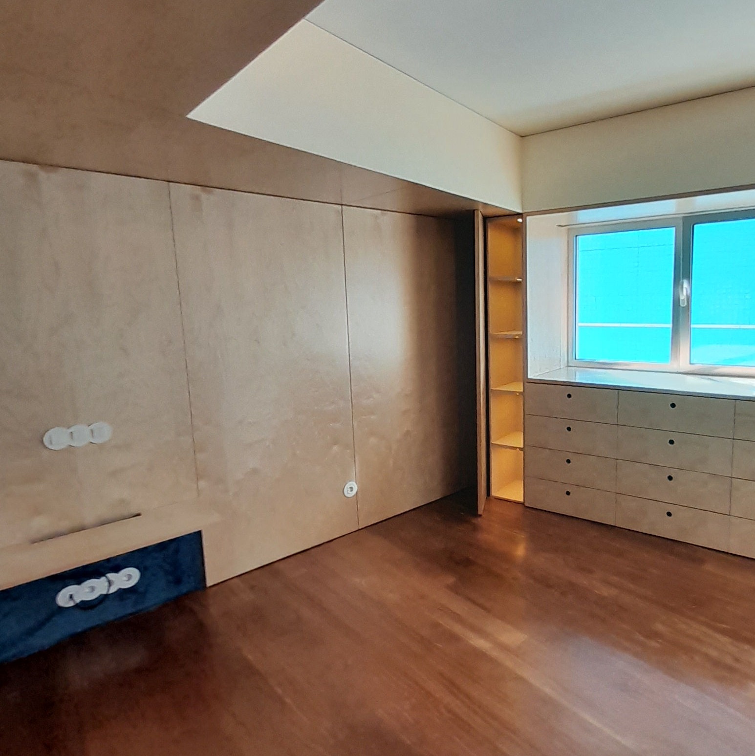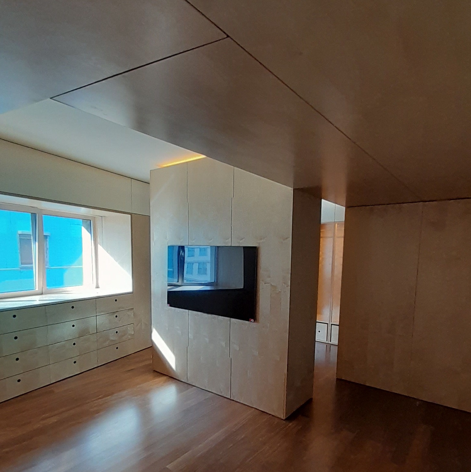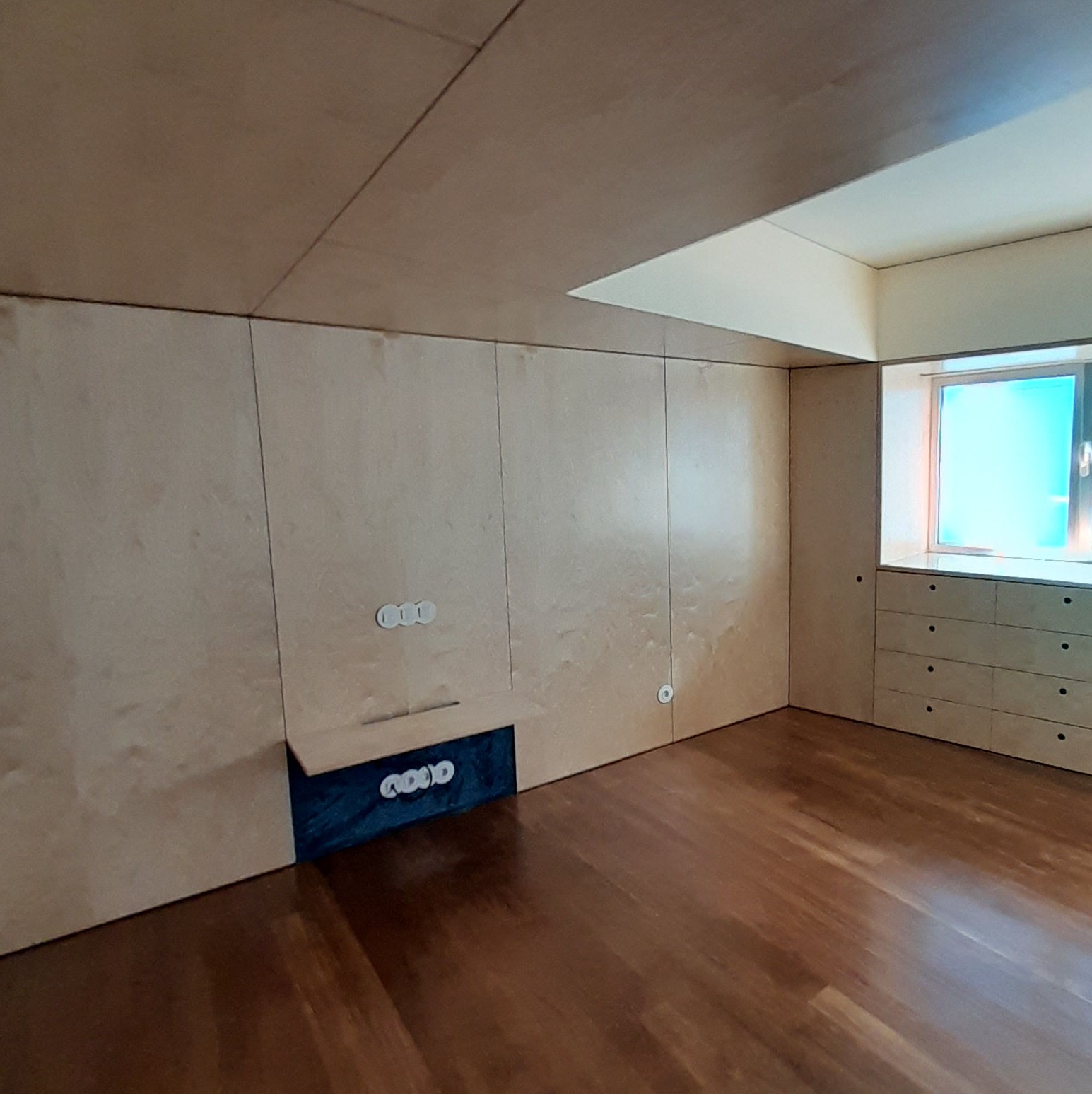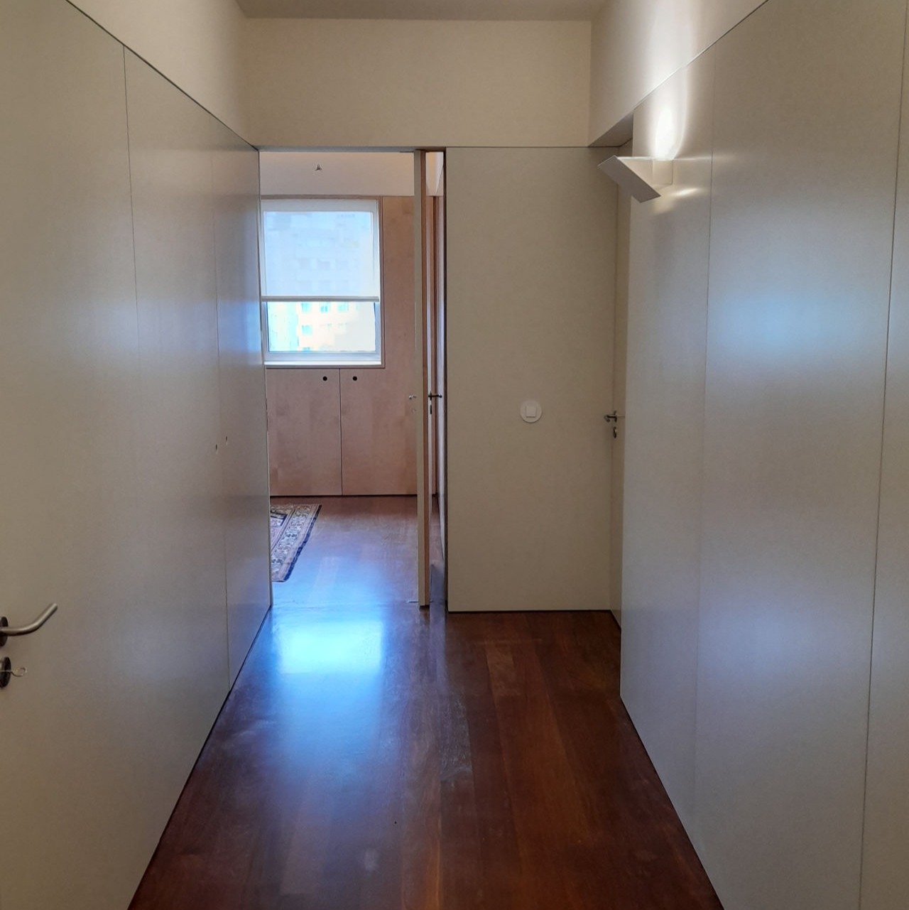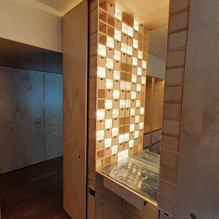 Reabilitação de apartamento T4, as paredes e as novas portas pivotantes foram revestidas com painéis de MDF folheado a Bétula, assim como os armários. Foi criado um closet com vários armários e em particular um toucador estes desenhados com o maior rigor de forma a satisfazer as necessidades do cliente. O escritório também foi alvo de intervenção, onde foram criadas estantes com um design atual, sem juntas à vista e também em madeira de Bétula.