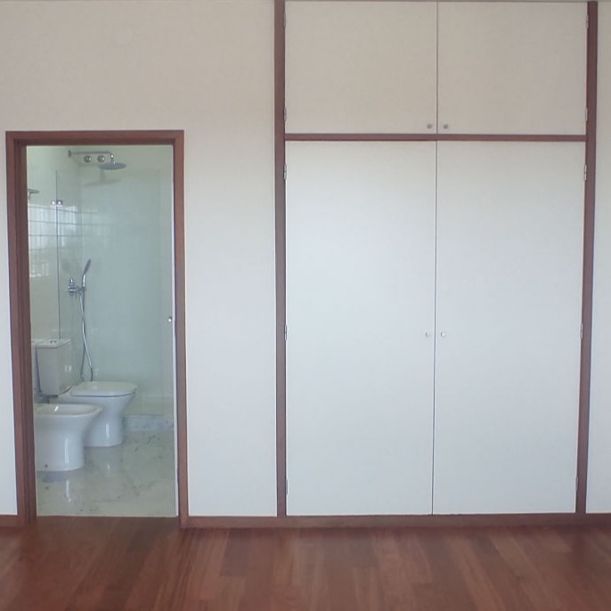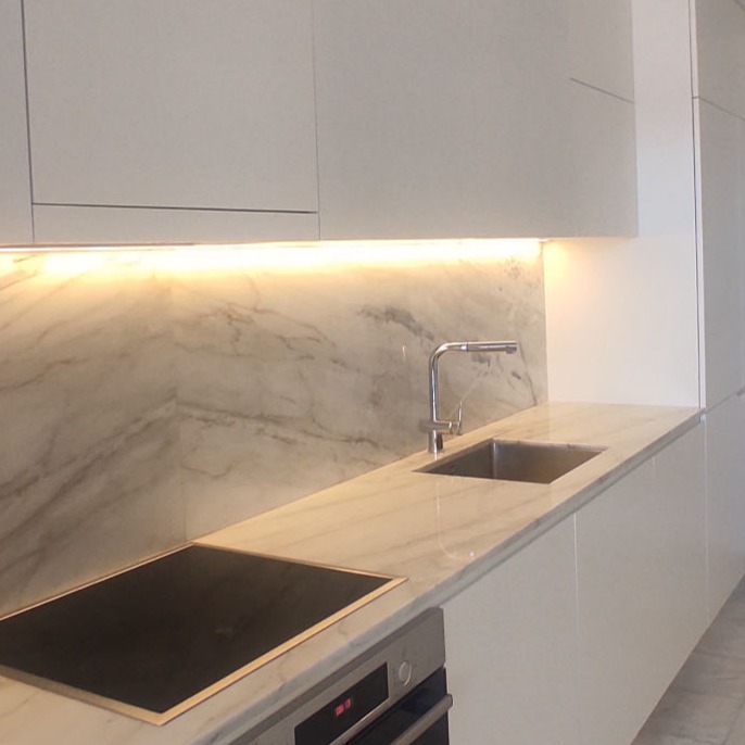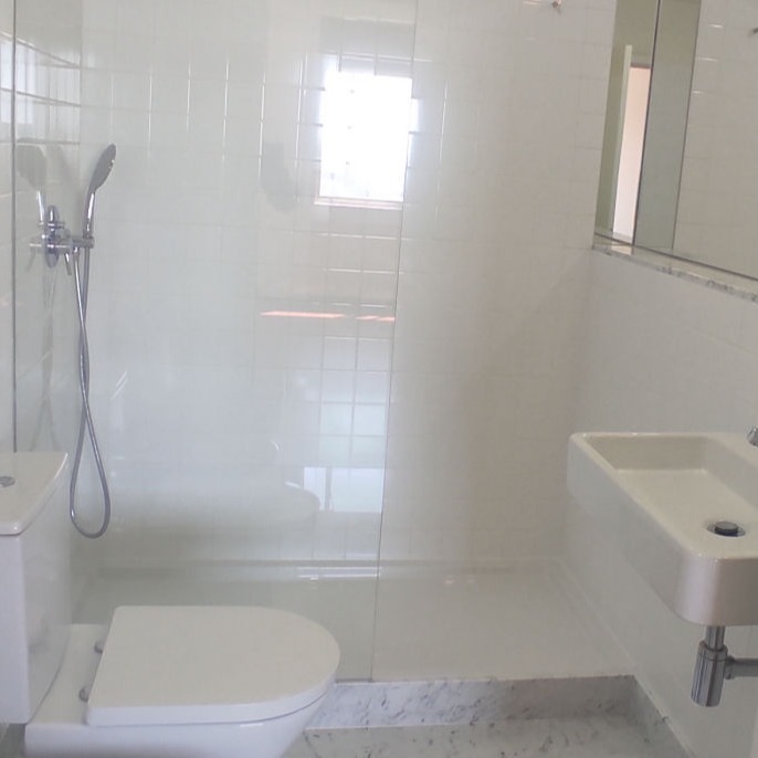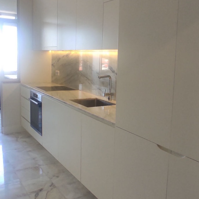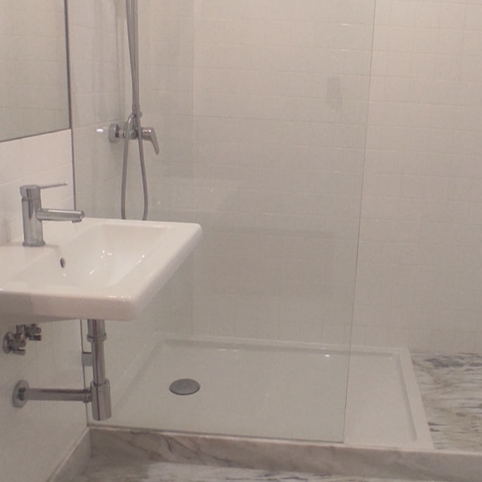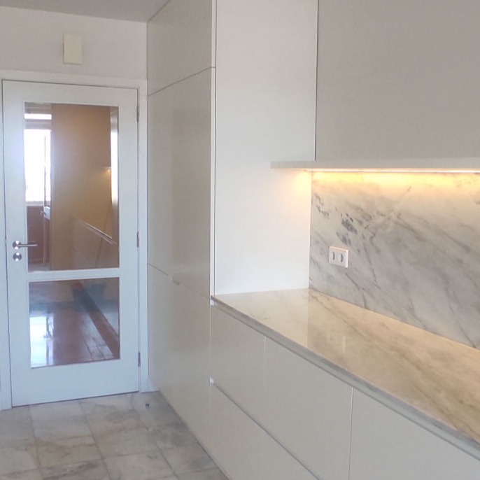 Reabilitação de apartamento T2, com duas casas de banho. Os armários da cozinha são em MDF lacado em oficina, e os tampos em Mármore Estremoz. Os revestimentos da casa de banho são no pavimento Mármore Estremoz e nas paredes azulejos 10x10 "Cinca" brancos.